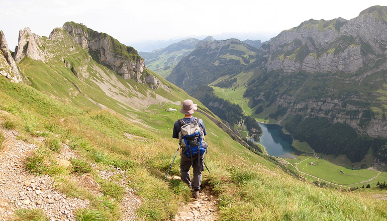 Schäfler oben, Seealpsee unten, darüber der Marwees-Grat ganz rechts