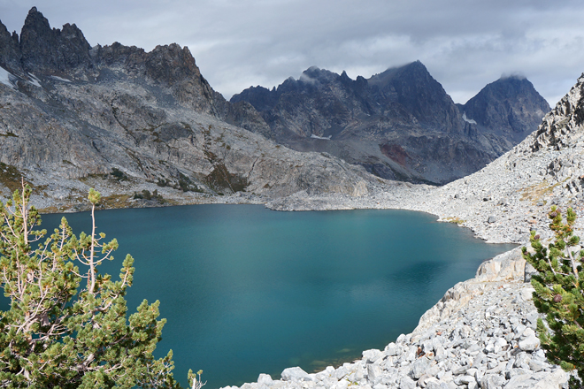 Cecile Lake mit Mt. Ritter and Banner Peak in Wolken