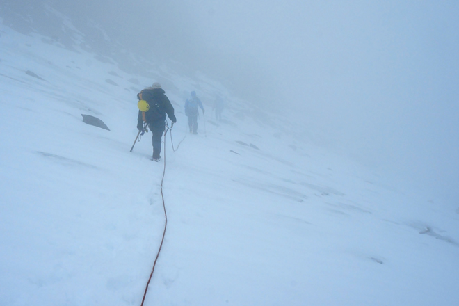 Abstieg von der Fuorcla da la Sella in Wolken