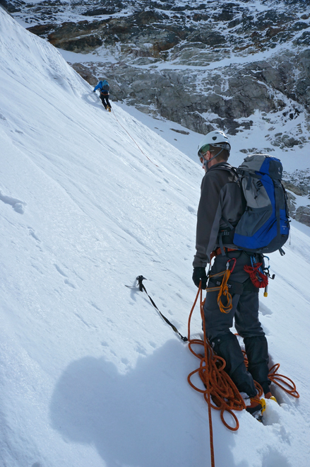 im steilen Firncouloir hoch zur Fuorcla Crast'Agüzza