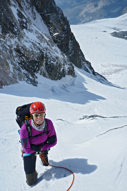 Blick vom steilen Firncouloir hinab auf den oberen Scerscen-Gletscher