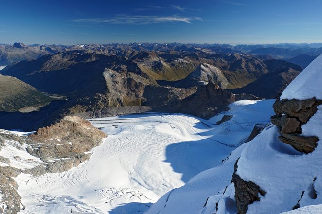 Blick hinab auf Pers-Gletscher und Diavolezza Bergstation