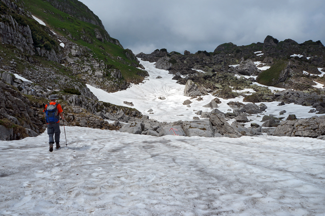 Abstieg im Schnee (~1900 m im Juli!)