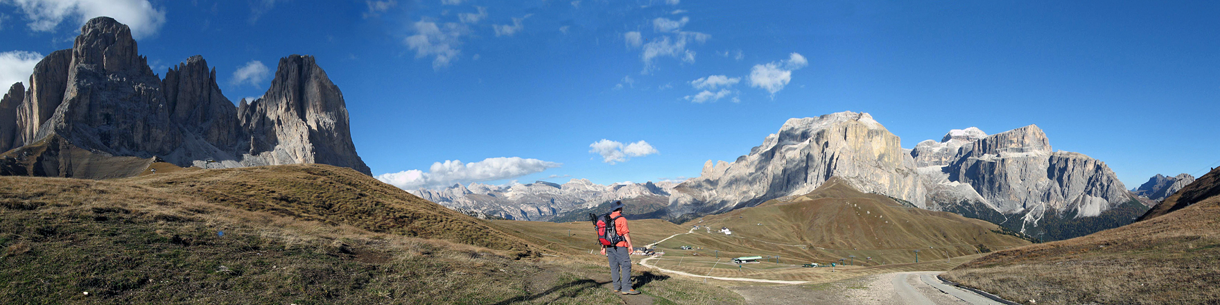 oberhalb des Sella Jochs: Langkofel Gruppe links und Sella Massiv rechts