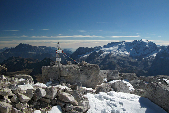 Gipfel des Piz Boe (3152 m) mit Marmolada im Hintergrund