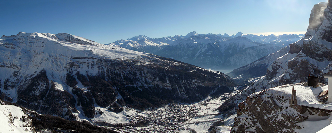 Blick vom Gemmipass auf Leukerbad und Walliser Berge