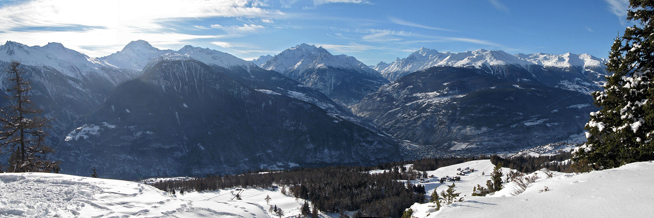 Panorama der 4000er mit Fletschhorn, Dom etc. (Mischabel Gruppe), Matterhorn, Weisshorn, u.a.