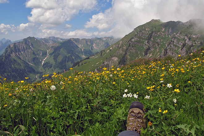 still life with mountains, flowers, and boot
