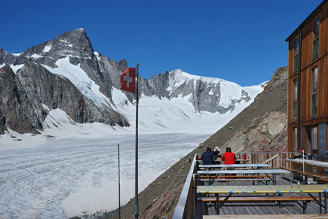 Ausblick von der Terasse der Finsteraarhornhütte auf Fiescherfirn und Grosses Grünhorn
