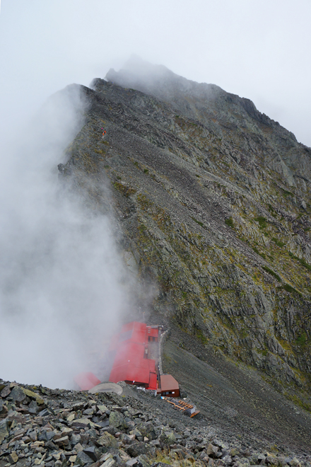 Blick hinab auf Hotaka-dake Hütte im engen Sattel