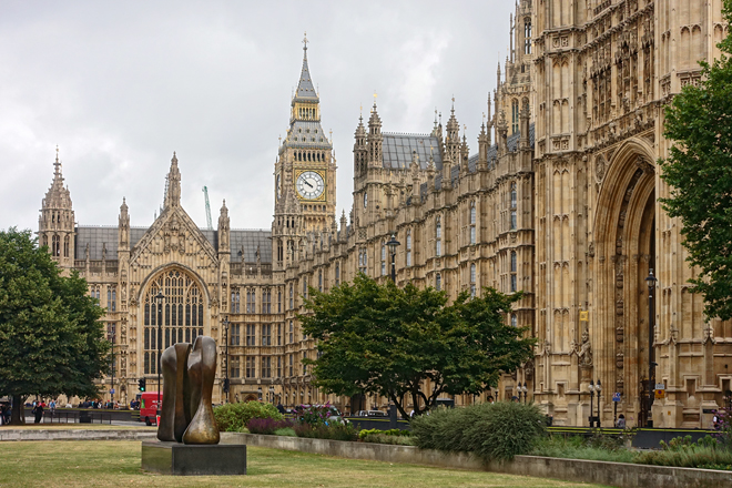 Palace of Westminster with Henry Moore's 'Knife Edge - Two Piece'