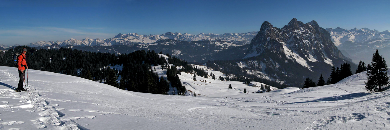 Ausblick vom Hochstuckli auf Mythen und Glarner und Urner Alpen