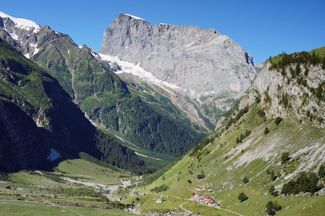 beim Aufstieg zur Spannorthütte: Blick auf die Ostwand des Titlis oberhalb des Surenentals mit Alp Stäfeli