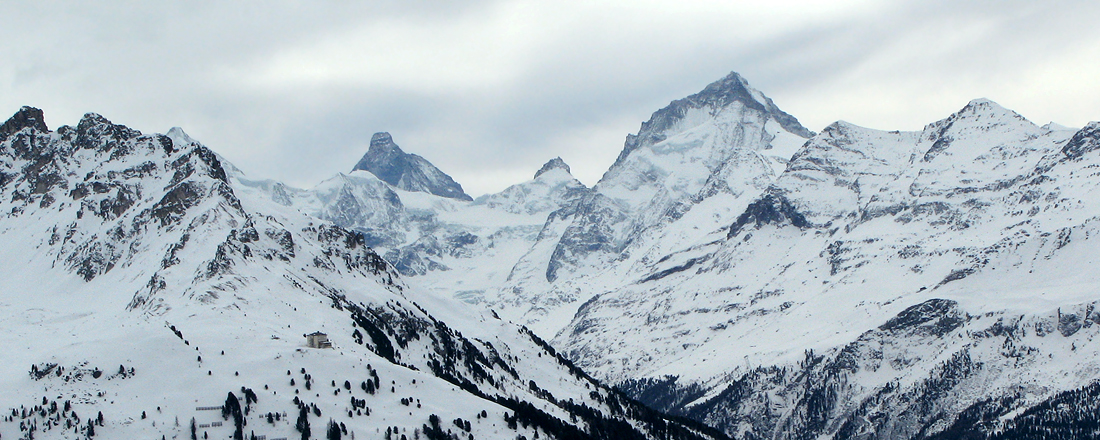 zoom in: Matterhorn und Dent Blanche, im Vordergrund Hotel Weisshorn