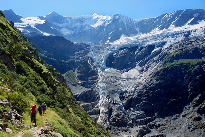 den Hang entlang vor dem Ischmeergletscher mit Kleinem und Grossen Fiescherhorn