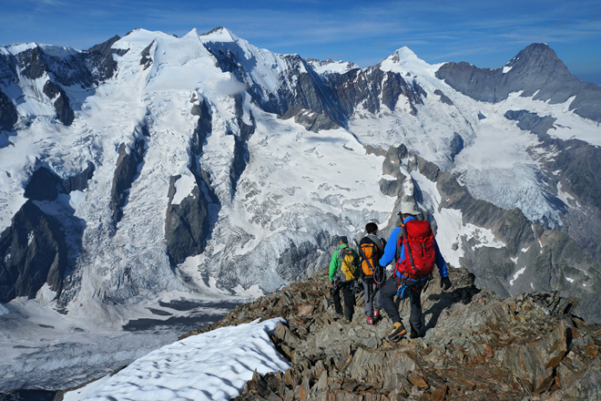und hinunter geht's (vor Fiescherhorn, Mönch und Eiger)