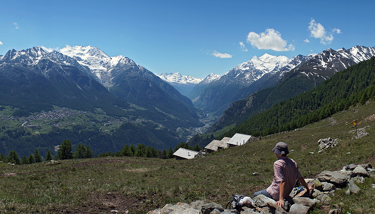 Aussicht von Pletsche auf Grächen, Nadelhorn (4327m) etc links, das Mattertal mit Breithorn (4159m) im Hintergrund, und Weisshorn (4506 m) etc rechts